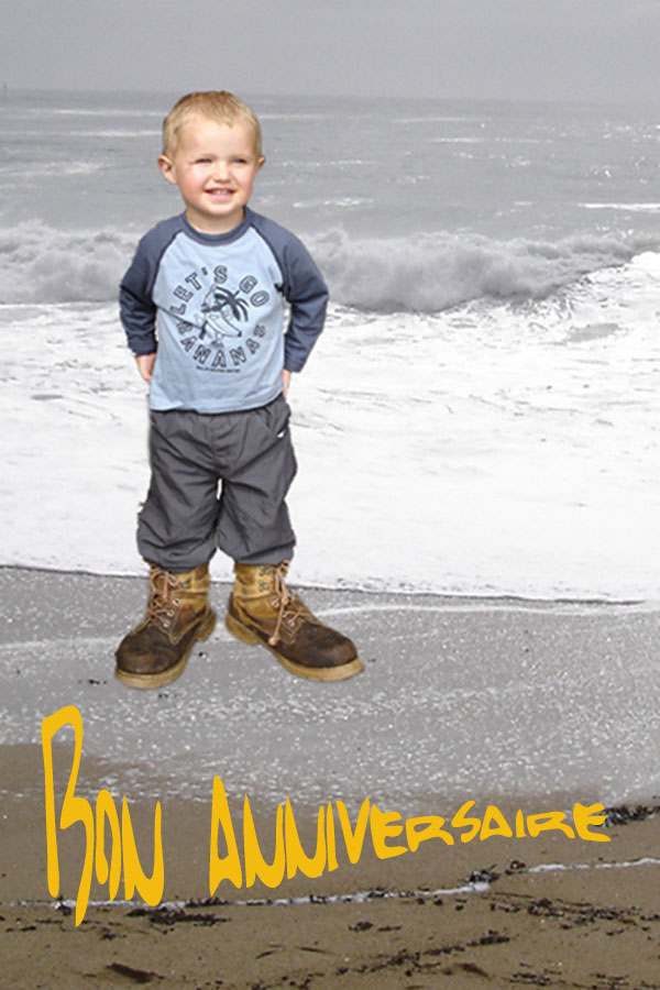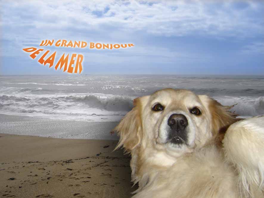 Sélection du chien, modification de la couleur des yeux, réglages des niveaux, calque placé sur le photo de la mer, ajout d'un texte... | Kangoo en vacances |