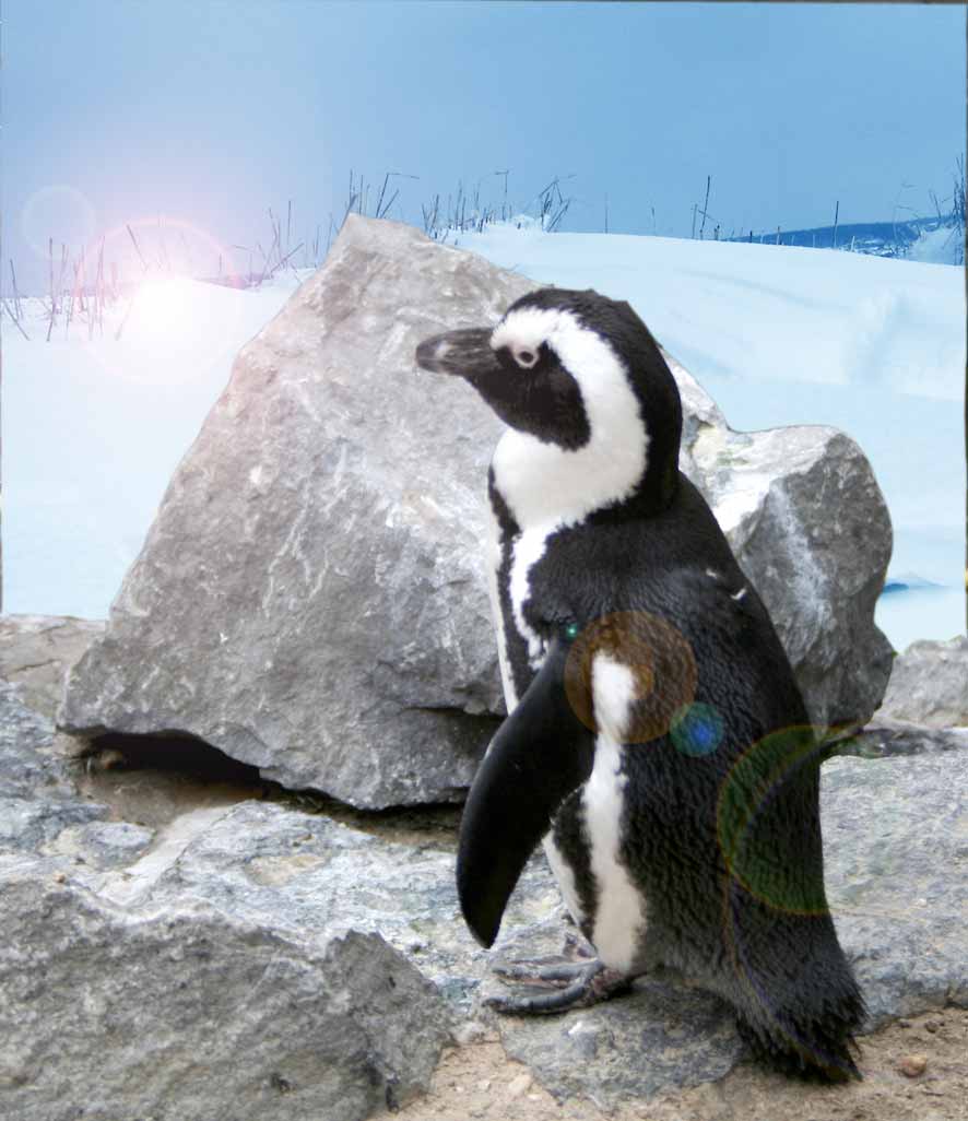 Recadrage, sélection du manchot et de la pierre, insertion d'un calque de placé sous le calque du manchot, masque de fusion, halo (filtre).. | Ou...la neige |